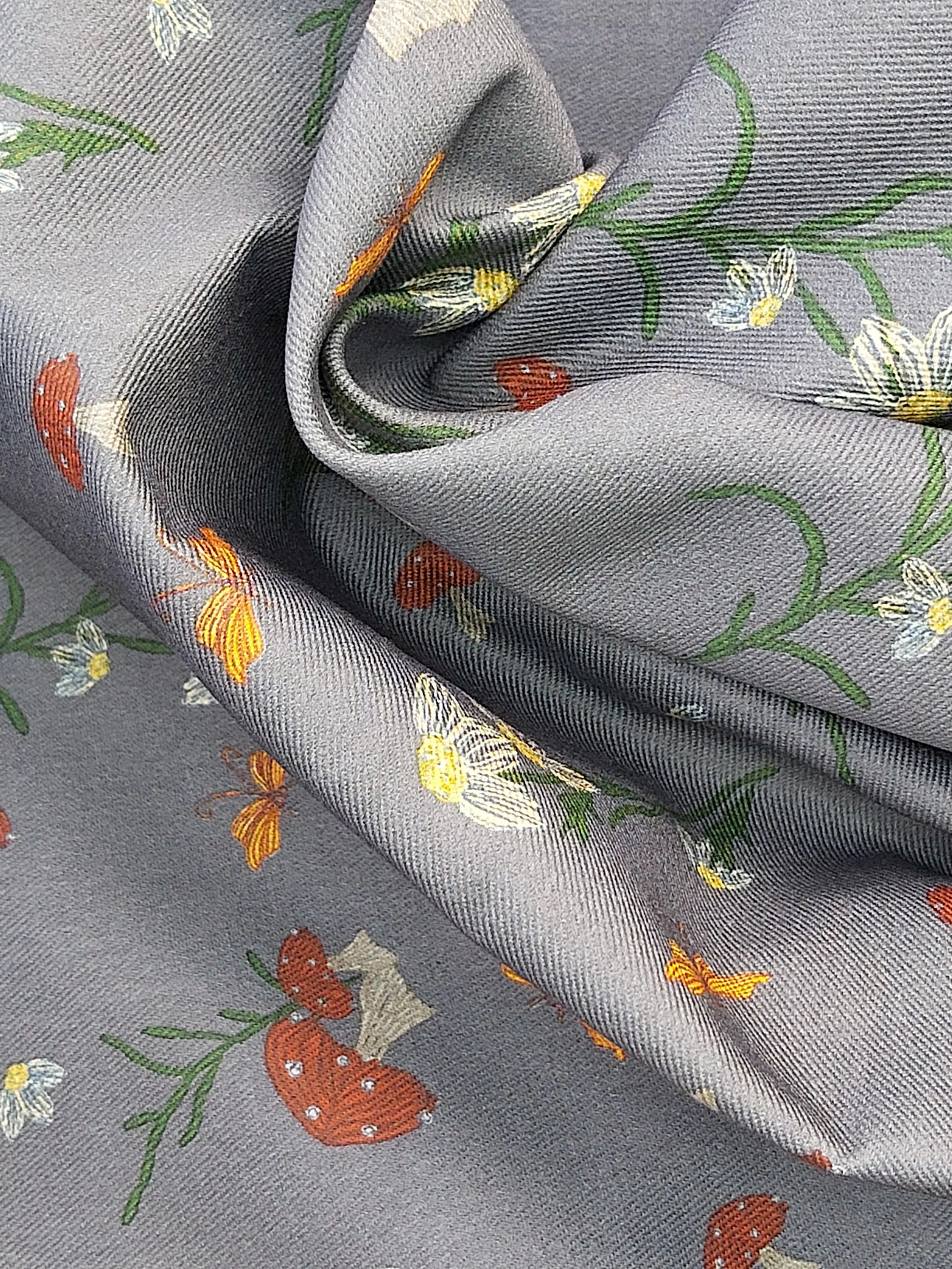 Strong and durable drill fabric with a scattering of Autumn elements on an old blue background.
